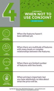 We look to conjoint to help determine an optimal or ideal product scenario, to help price a product given its features, or to suggest whether a client could charge a premium or require a discount. It has a wide range of uses, but it isn’t always a good fit: